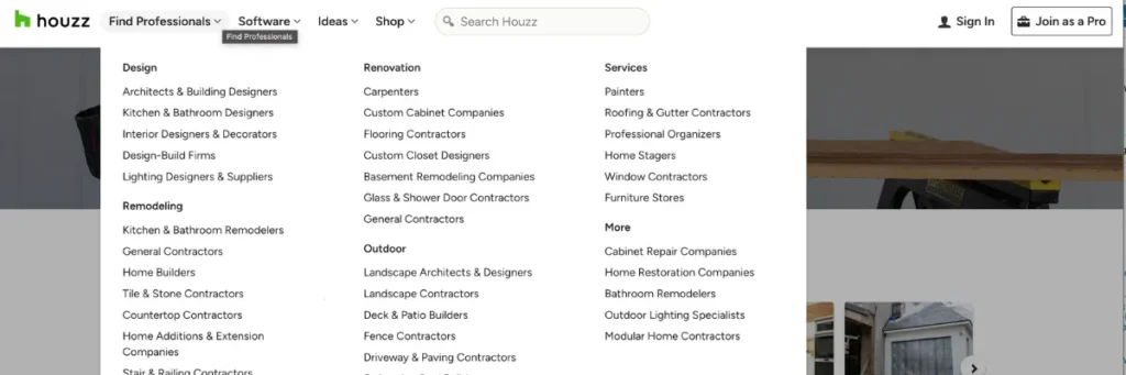 From the customer perspective, Houzz feels more like a design-focused inspiration hub. Homeowners can browse thousands of project photos, save design ideas, and then connect with the professionals who created them. This makes the platform ideal for customers in the research and planning stage of a home improvement project.